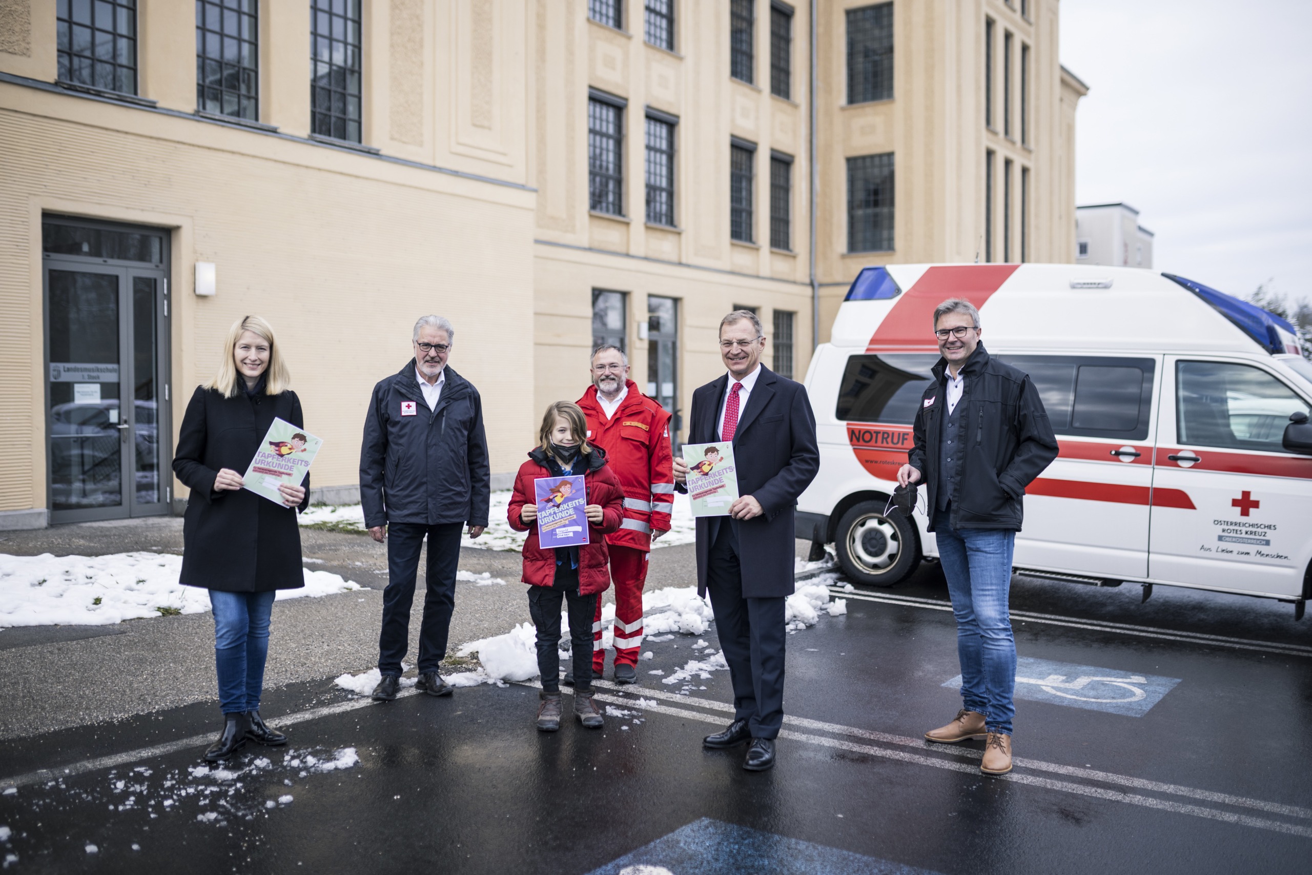 Bildtext: LH-Stellvertreterin Christine Haberlander, OÖ. Rotes Kreuz-Präsident Walter Aichinger, Leopold, der sich gegen Corona impfen ließ, Urban Schneeweiß, Bezirksstellenleiter und Bezirksrettungskommandant von Steyr, Landeshauptmann Thomas Stelzer und OÖ. Rotes Kreuz-Landesgeschäftsstellenleiter-Stv. Thomas Märzinger.