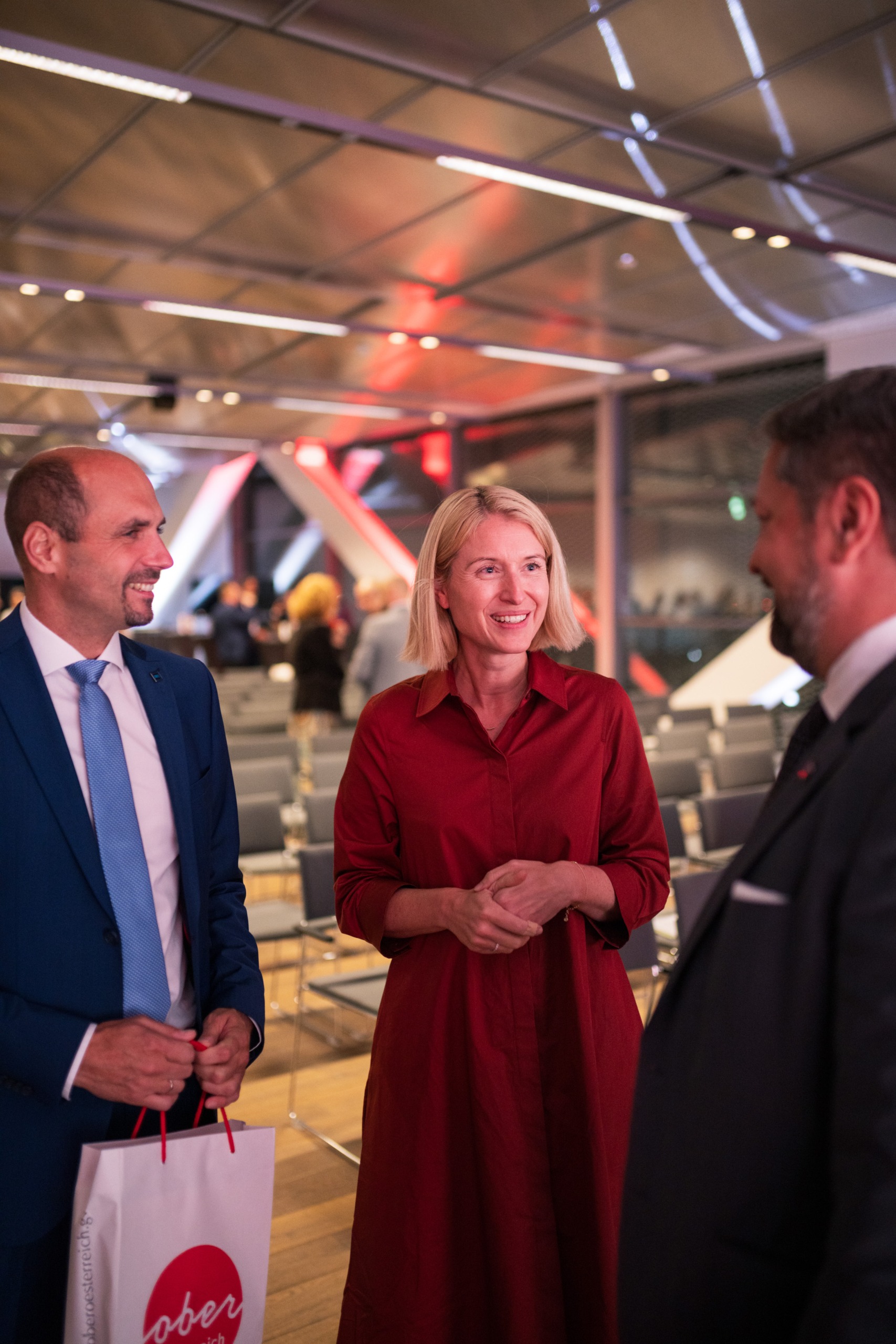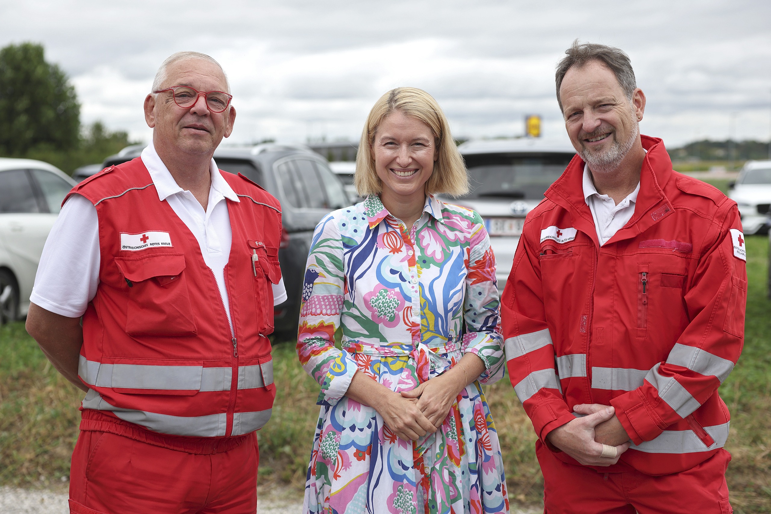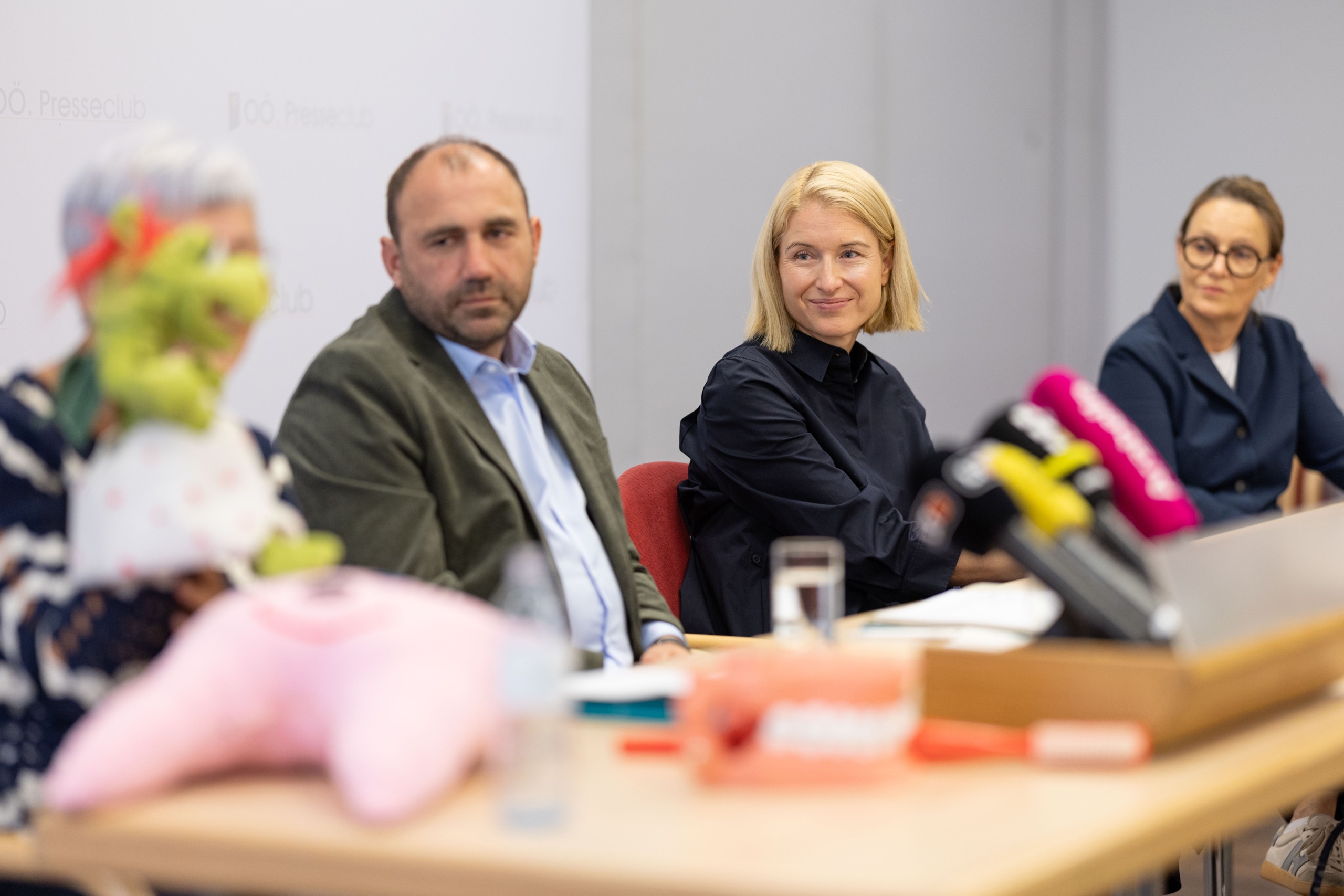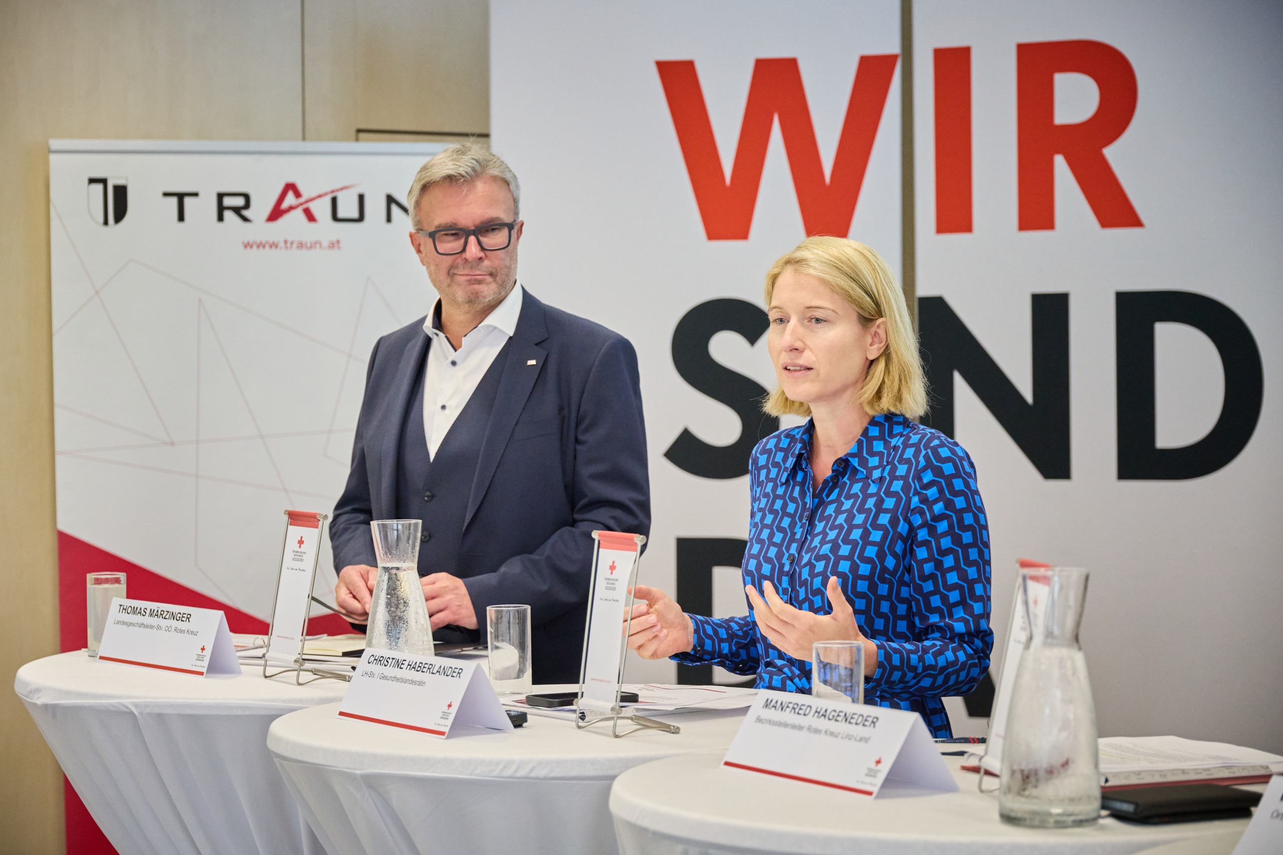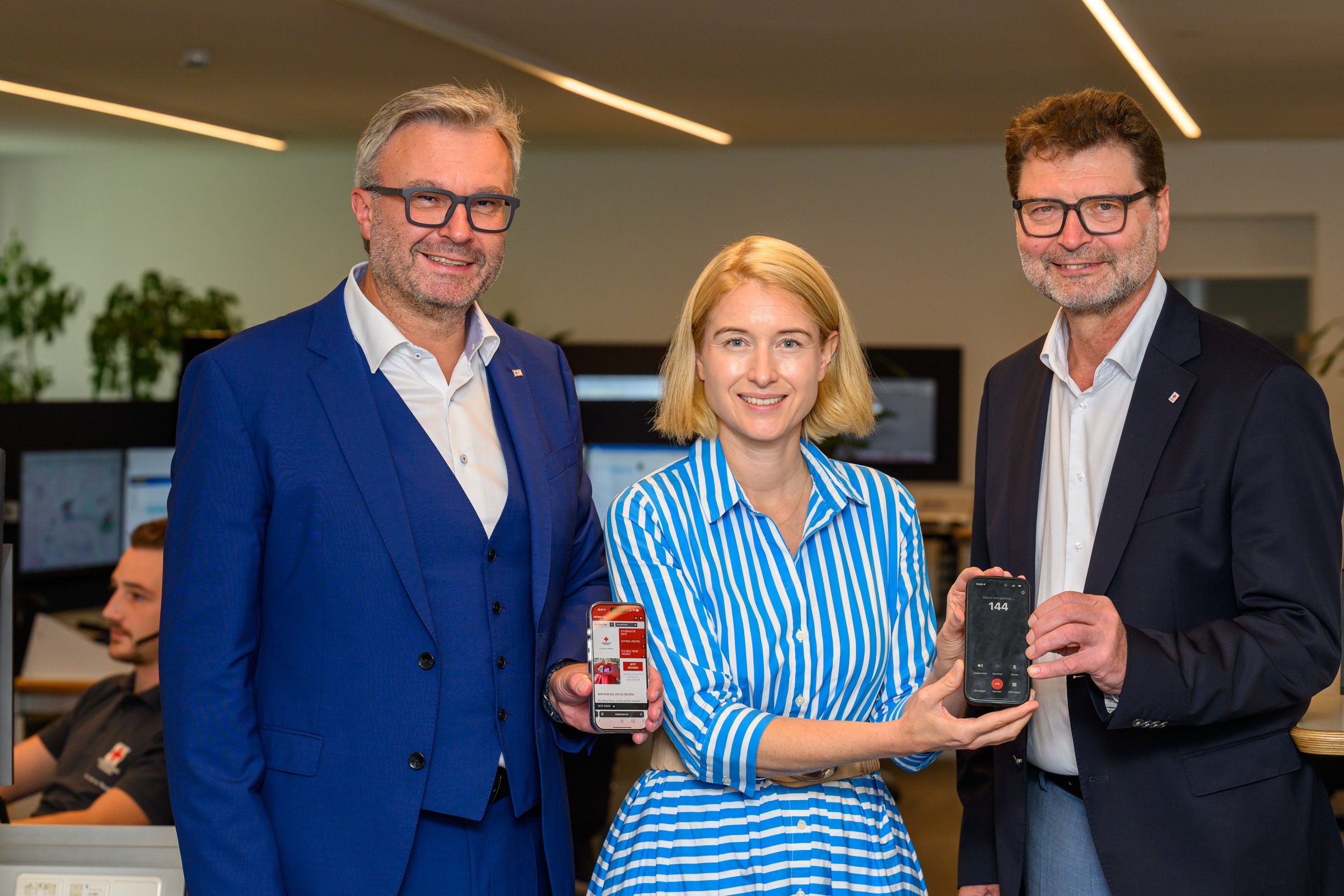 Im Bild: Thomas Märzinger, Landesgeschäftsleiter-Stv. OÖ. Rotes Kreuz / Gesundheitslandesrätin & LH-Stellvertreterin Mag.a Christine Haberlander / Dipl.-Päd. Gottfried Hirz, Präsident des OÖ. Roten Kreuzes bei der Pressekonferenz des OÖ Roten Kreuzes zum Thema „Emergency Eye – Digitale Unterstützung, wenn jede Sekunde zählt“. Aufgenommen am 8. August 2025.