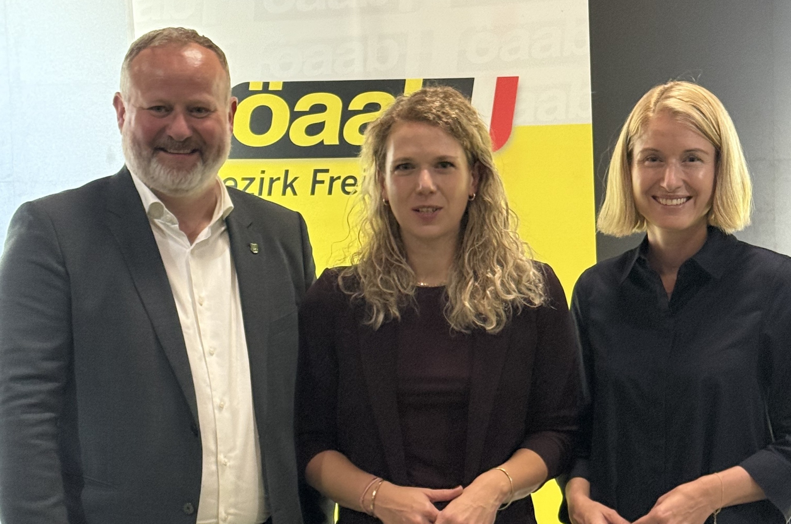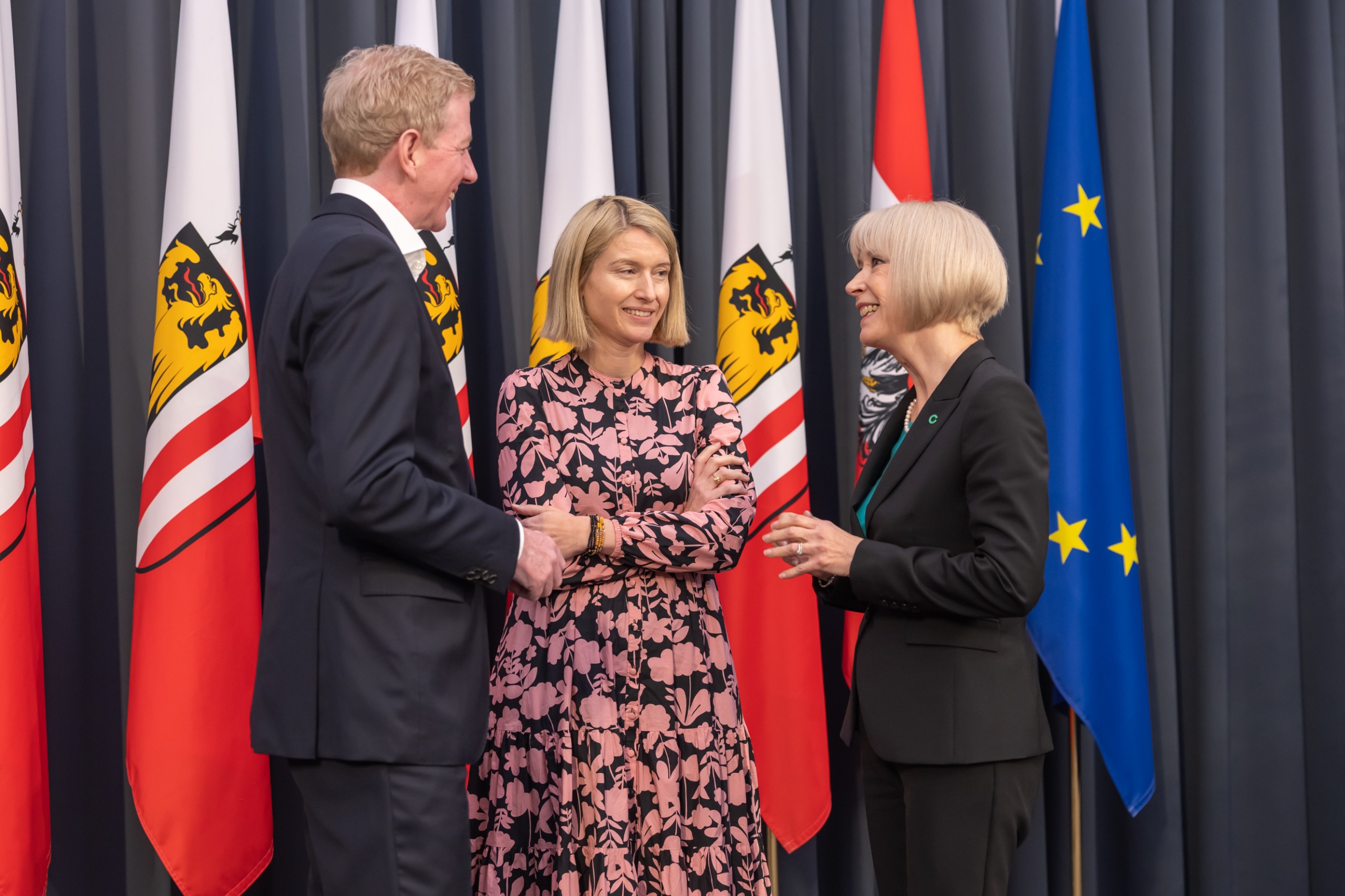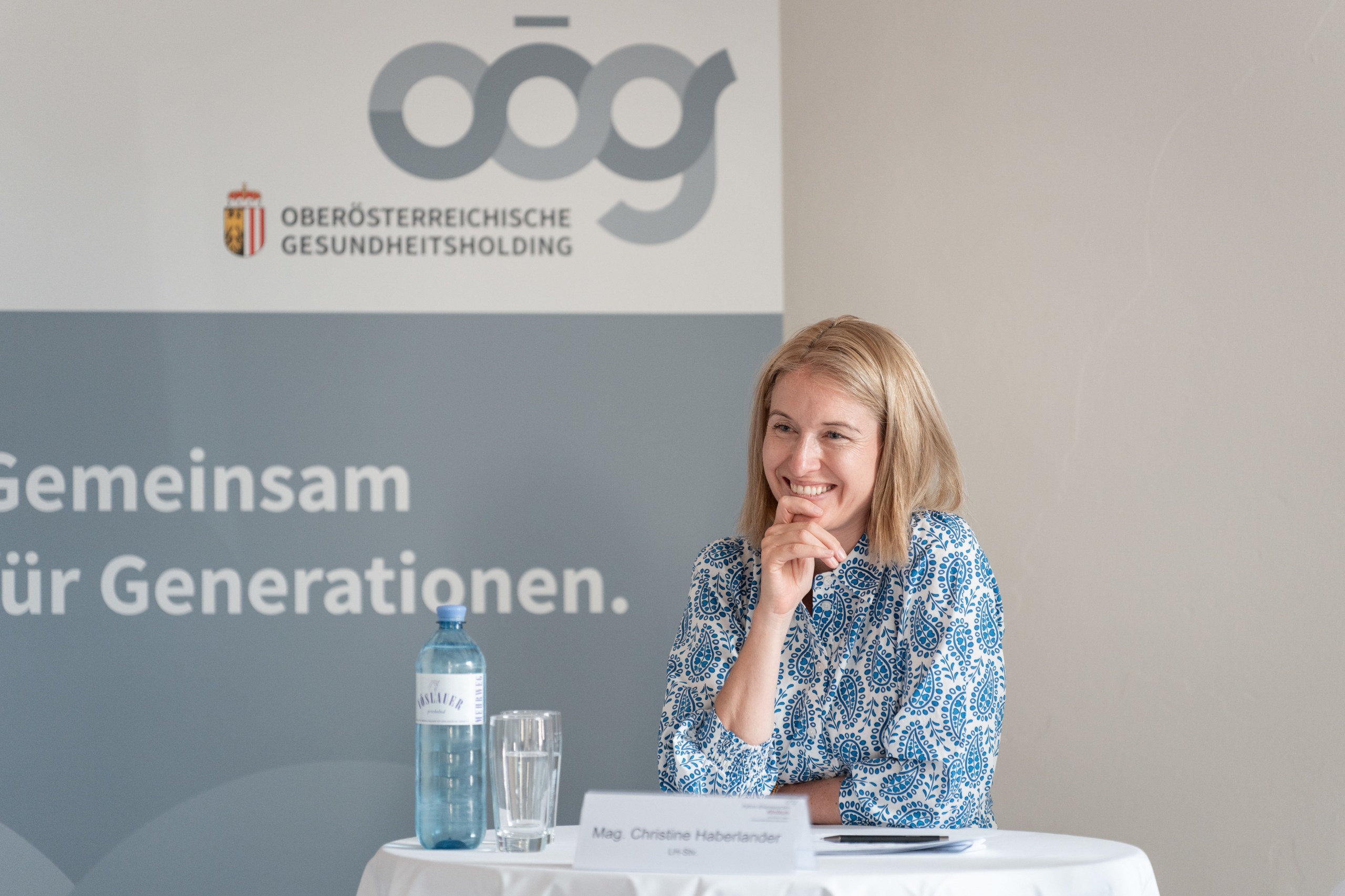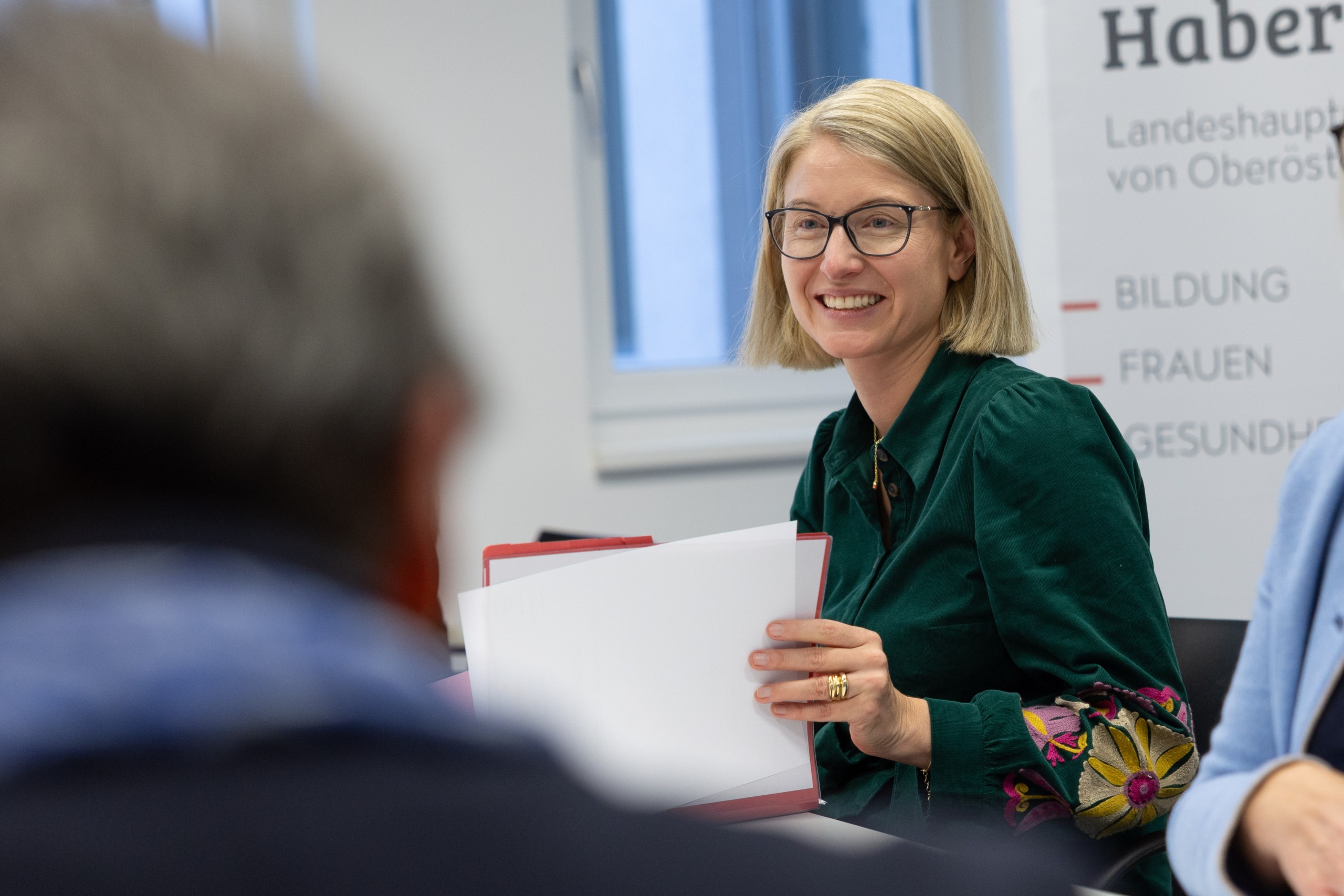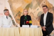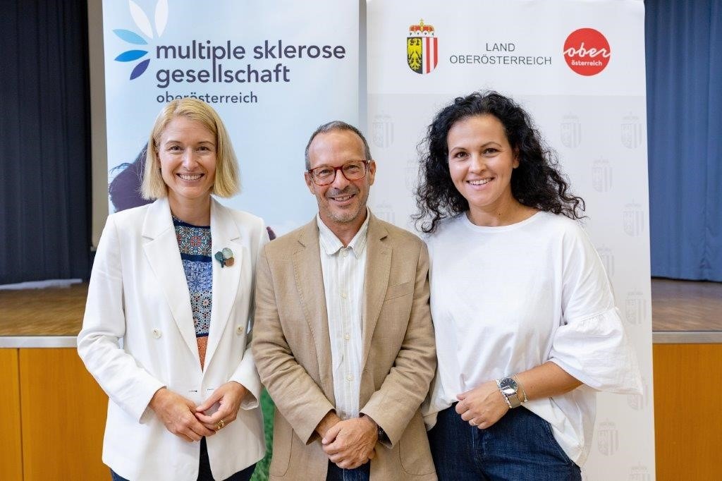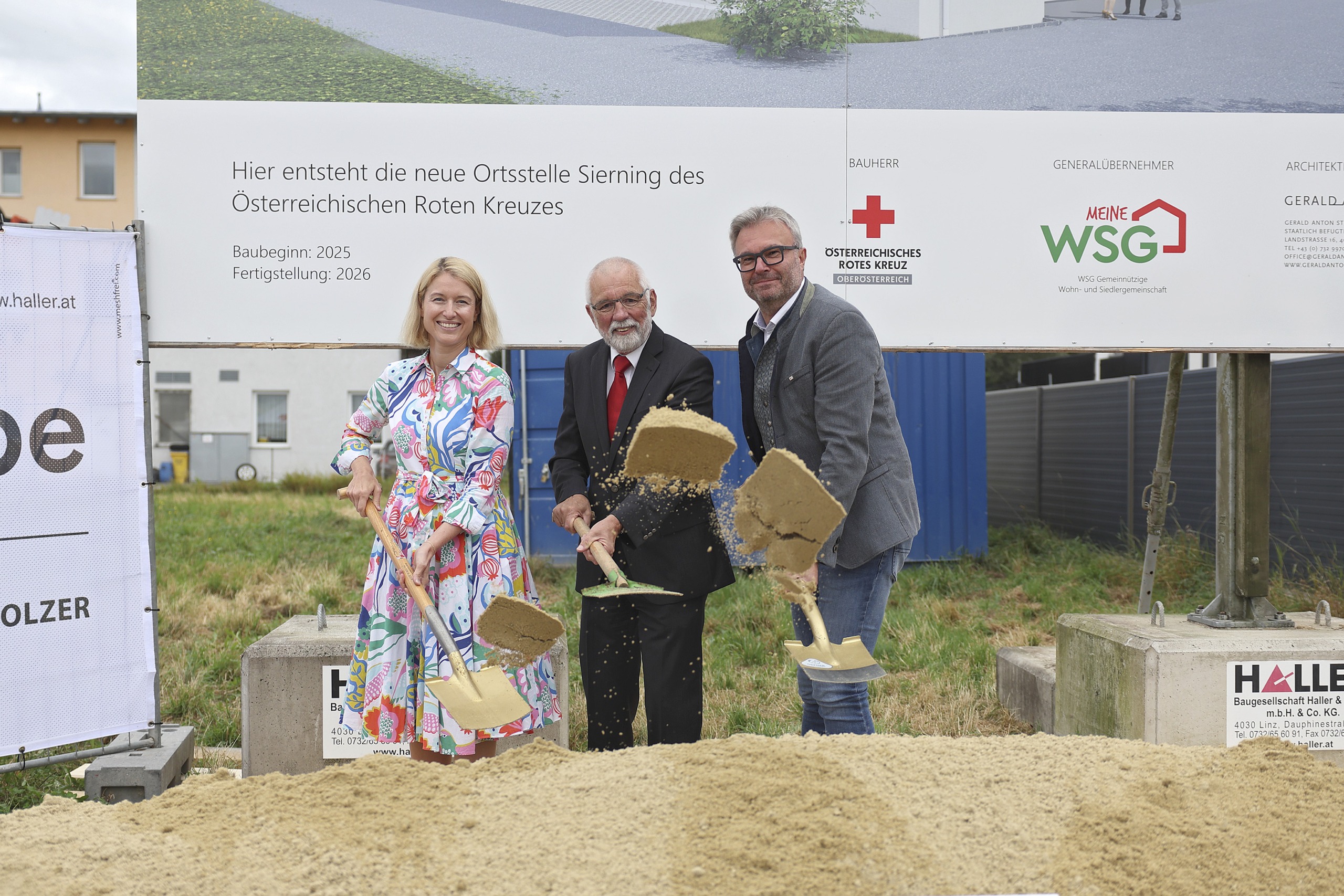 Im Bild: Thomas Märzinger, Landesgeschäftsleiter-Stv. OÖ. Rotes Kreuz / Gesundheitslandesrätin & LH-Stellvertreterin Mag.a Christine Haberlander / Dipl.-Päd. Gottfried Hirz, Präsident des OÖ. Roten Kreuzes bei der Pressekonferenz des OÖ Roten Kreuzes zum Thema „Emergency Eye – Digitale Unterstützung, wenn jede Sekunde zählt“. Aufgenommen am 8. August 2025.