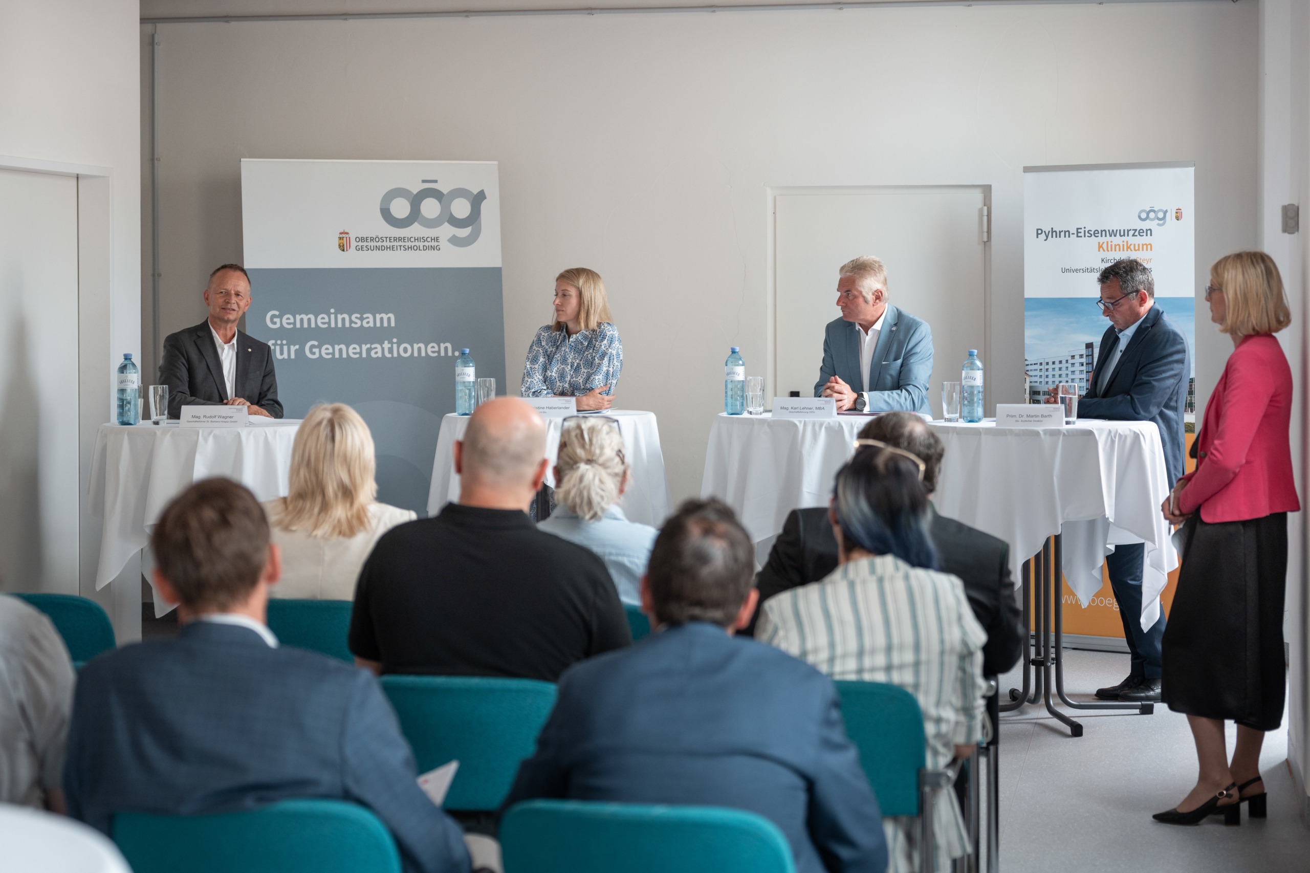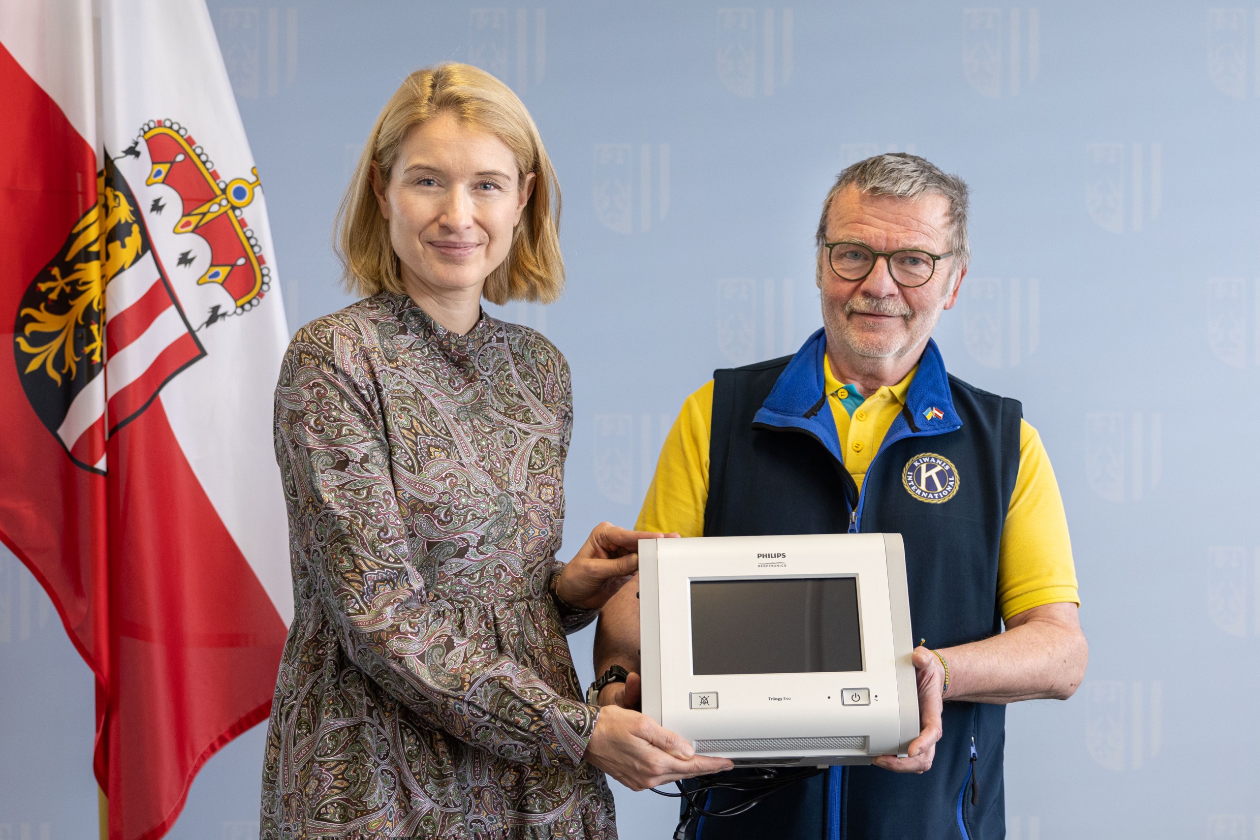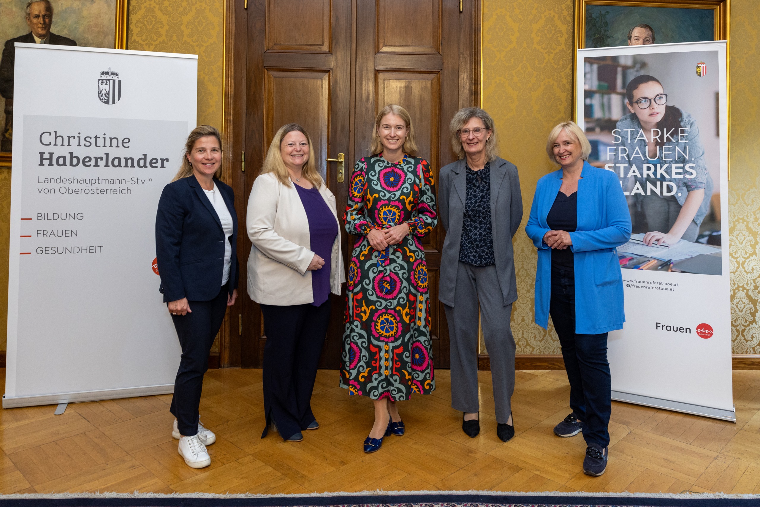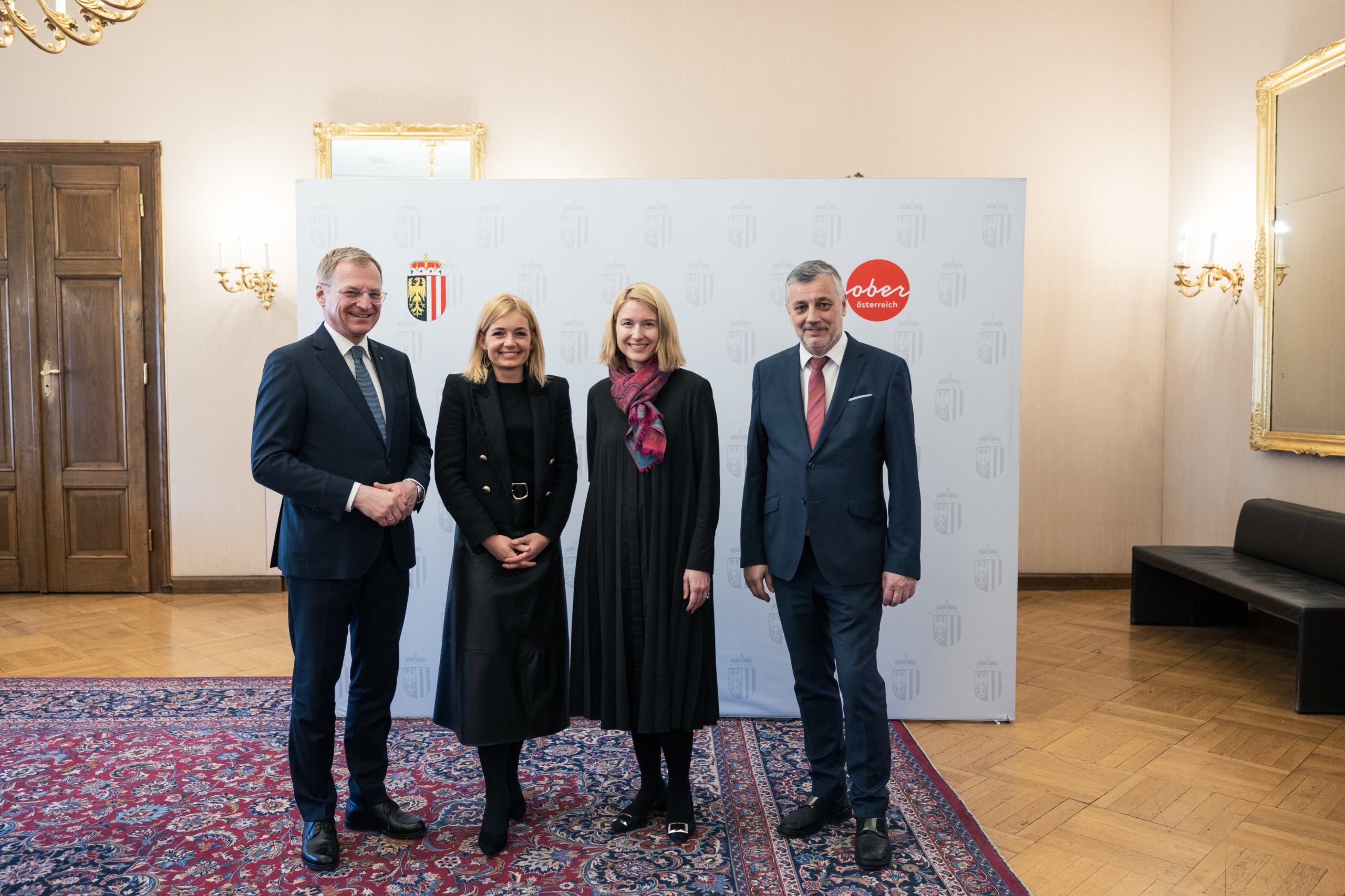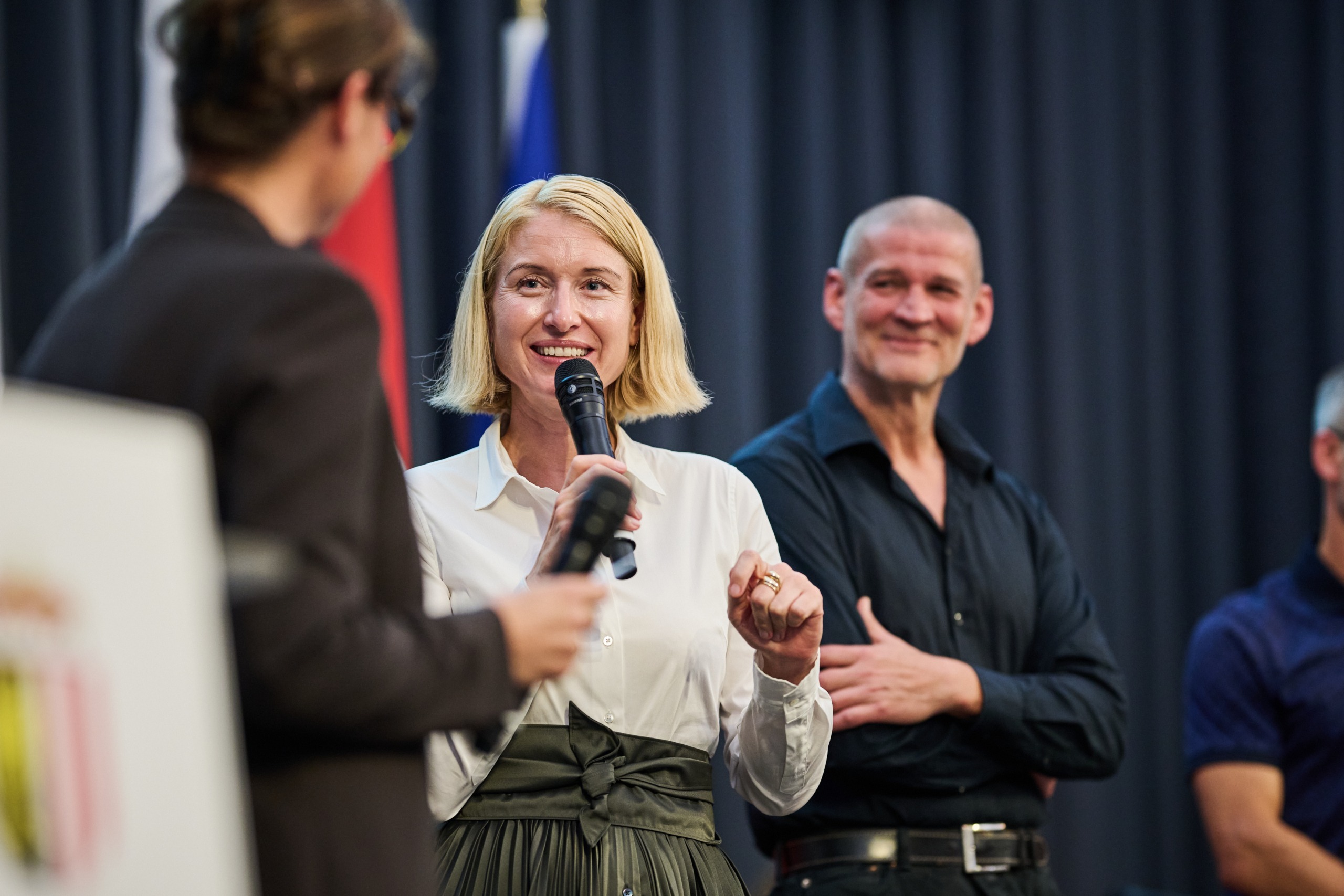 Im Bild: Thomas Märzinger, Landesgeschäftsleiter-Stv. OÖ. Rotes Kreuz / Gesundheitslandesrätin & LH-Stellvertreterin Mag.a Christine Haberlander / Dipl.-Päd. Gottfried Hirz, Präsident des OÖ. Roten Kreuzes bei der Pressekonferenz des OÖ Roten Kreuzes zum Thema „Emergency Eye – Digitale Unterstützung, wenn jede Sekunde zählt“. Aufgenommen am 8. August 2025.